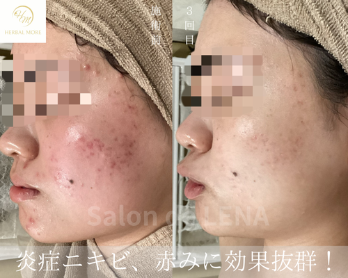 ▶︎▷ ハーブピーリングを3回継続 → 赤みが落ち着き、炎症ニキビも改善。肌の凹凸感がなめらかに変化。