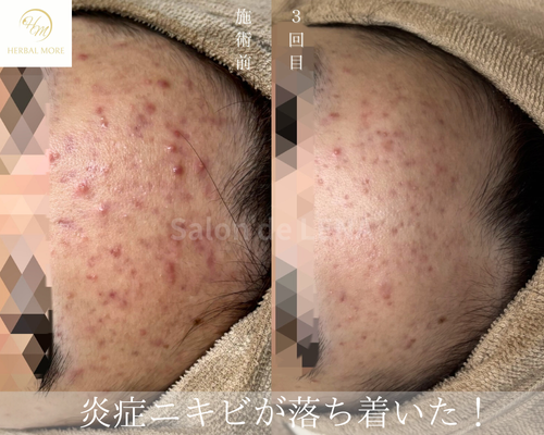 ▶︎▷ ハーブピーリングを3回継続 → 炎症が落ち着き、赤みも軽減。すっきりとした額に。